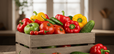 Tomatoes, chili peppers, bell peppers, and cucumbers