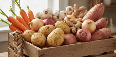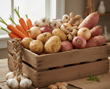 Potatoes, carrots, onions, garlic, ginger, and yams